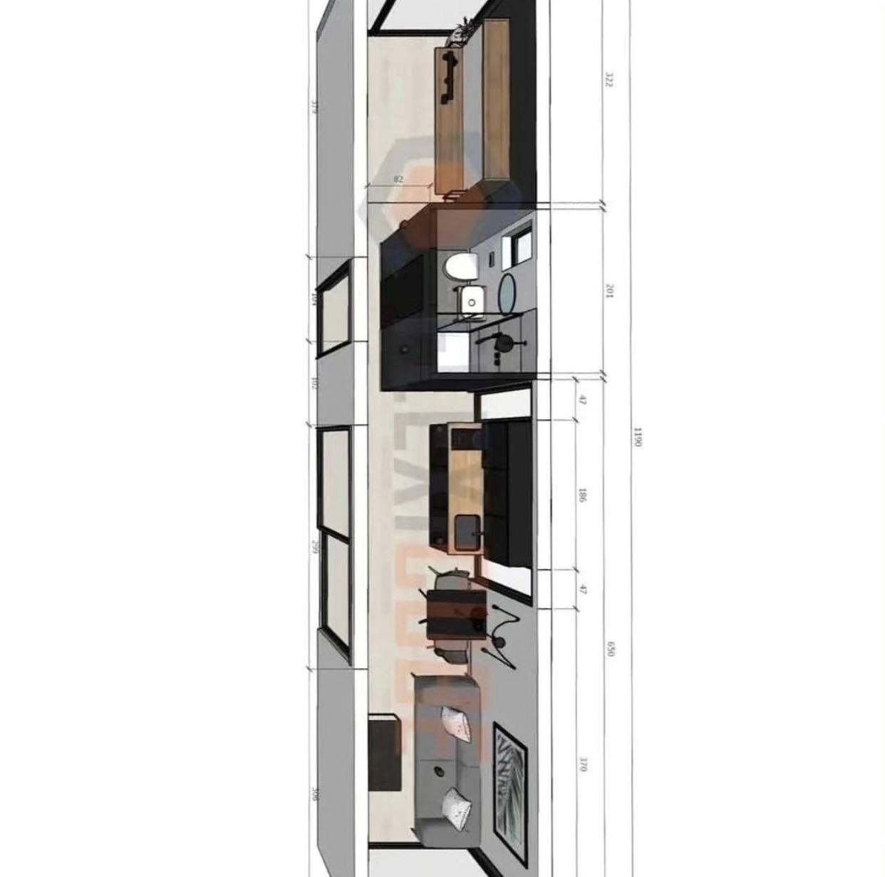 Dimensiones: 40 pies de largo x 8 pies de ancho, altura estándar.Cocina: Electrodomésticos modernos, encimera amplia y gabinetes de almacenamiento.Dormitorio: Cama matrimonial cómoda.Sala de estar: Sofá acogedor y espacio iluminado naturalmente.Baño: Compacto y completamente equipado.Vistas y luz: Grandes ventanales de cristal que ofrecen panorámicas y abundante luz natural.Climatización: Sistema de control climático para máximo confort.