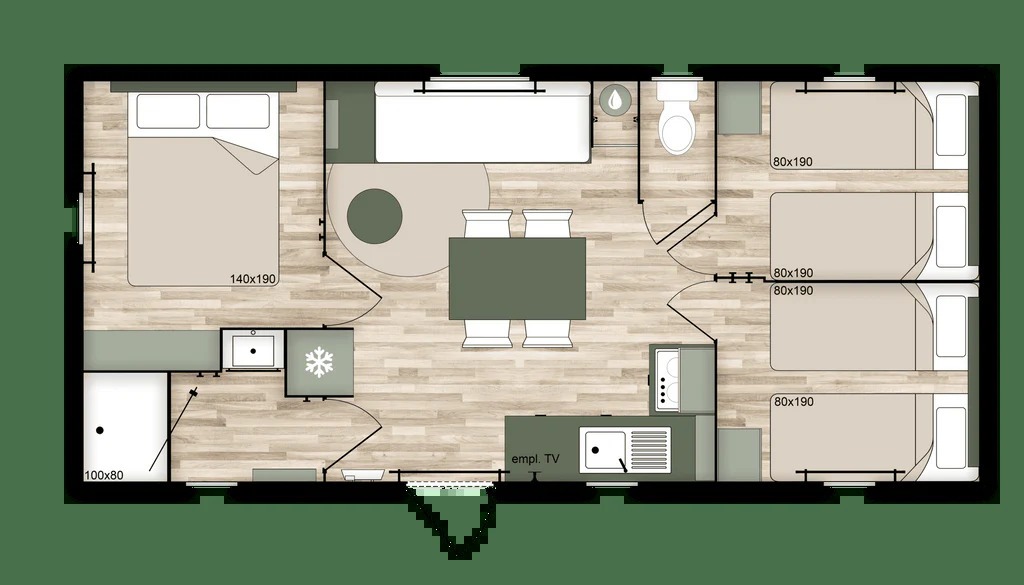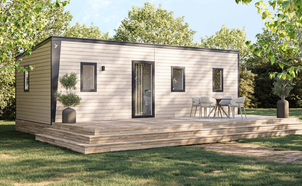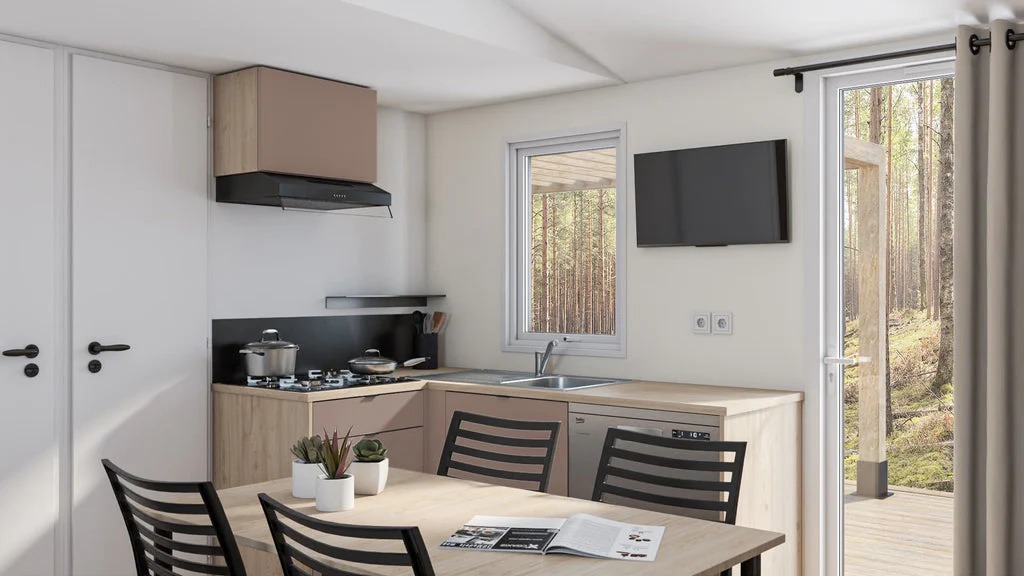 La Casa Móvil Trigano Deluxe está diseñada para ofrecer funcionalidad y confort en cada detalle. Su salón y sala de estar cuentan con un banco convertible en cama supletoria, cortinas tejidas opacas, mesa de madera 140 x 80 cm y iluminación LED de tres focos. Incluye tomas de TV y USB tipo C y un convector inteligente de 1000 W.