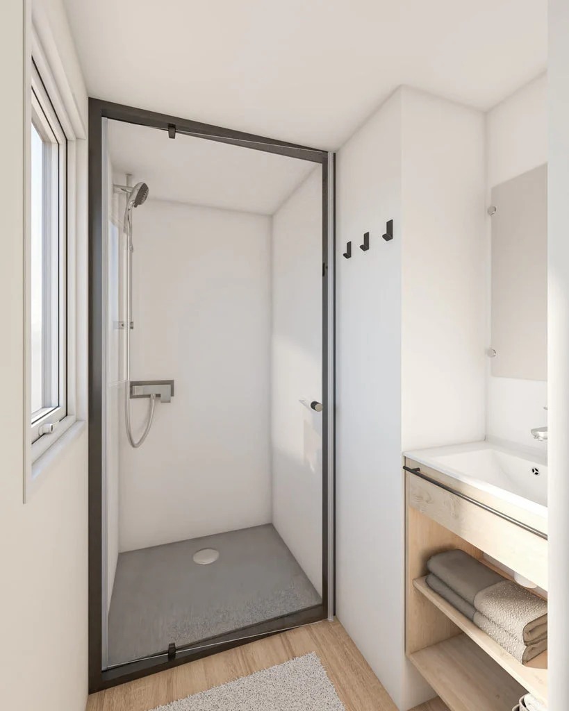 El equipo técnico ofrece doble acristalamiento 4/16/4, aislamiento térmico y acústico de alto rendimiento, detector de humo, puertas interiores de madera, linóleo de alto tráfico y calentador instantáneo a gas propano con circuito regulado.